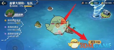 1、首先我们需要进入游戏主界面,点击冒险选择海域探险进入,找到如下图所示的鱼,在右侧点击钓鱼。