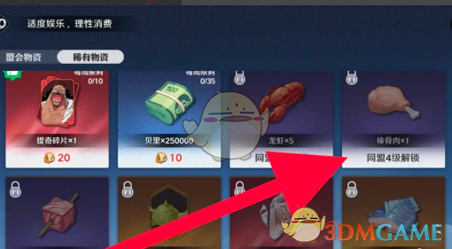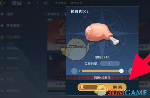2、在同盟商店页面,点击右侧的物品栏找到棒骨肉即可进入详情页。
