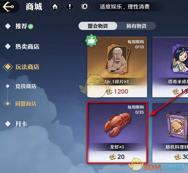 2、接着在同盟商店中,点击左侧的玩法商店,找到龙虾进行购买;