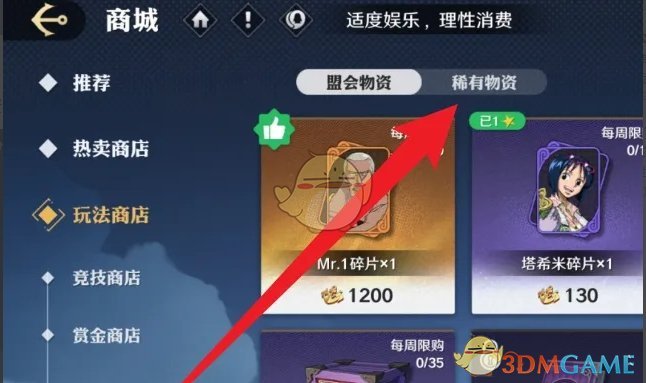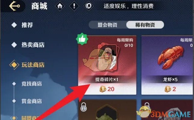 4、最后在稀有物资内筛选找到提奇碎片,消耗同盟竞技币即可完成购买;
