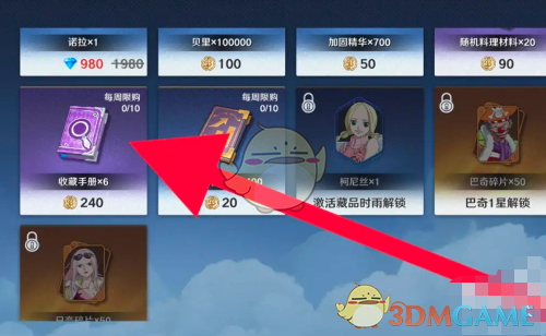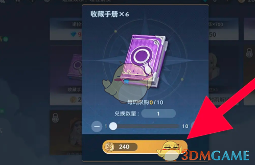 3、在收藏手册的弹框页面,点击购买,即可支付240金币购买获得,每周限购10个。
