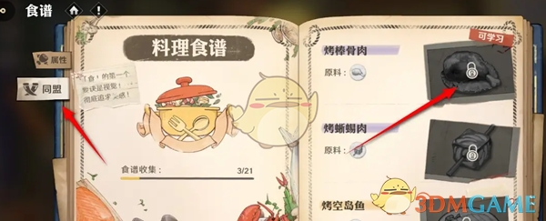 3、在料理食谱中,点击左侧的同盟,然后找到烤棒骨肉;