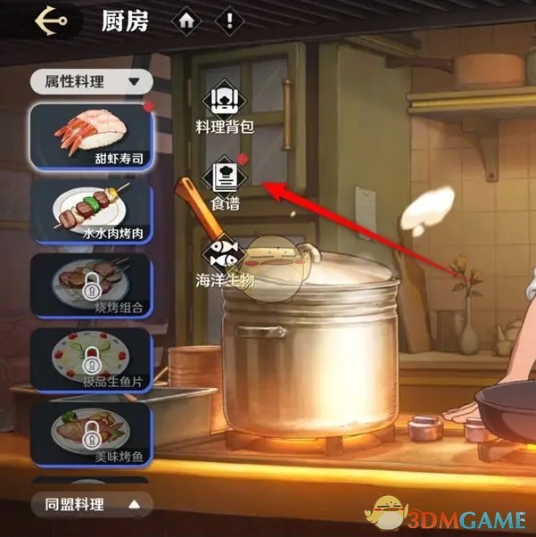 2、前往厨房后,继续点击左侧的食谱功能前往;