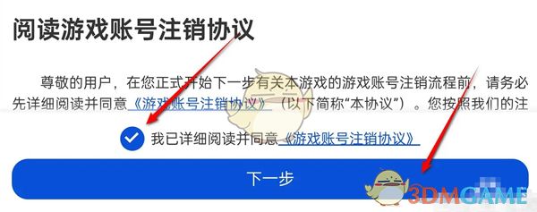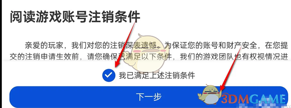 3、需要阅读注销账号条件,然后点击满足注销条件协议,点击下一步;