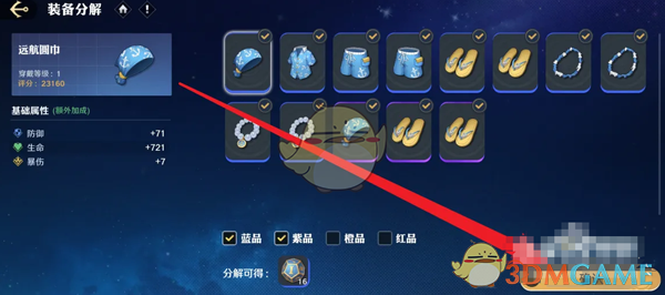 答:进入装备页面,点击分解,选择装备进行分解。