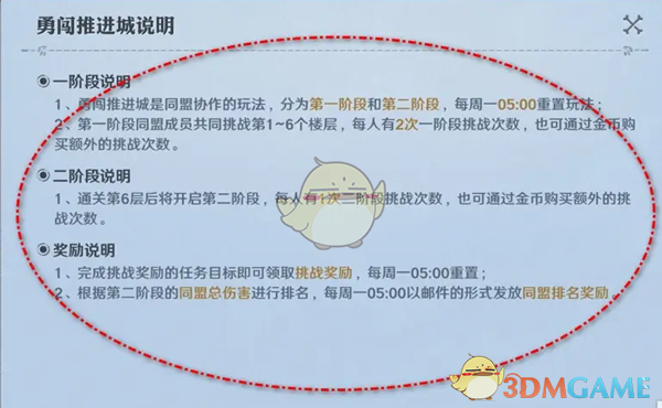 答:在同盟玩法找到勇闯推进城,点击上方的感叹号即可查看到玩法说明。