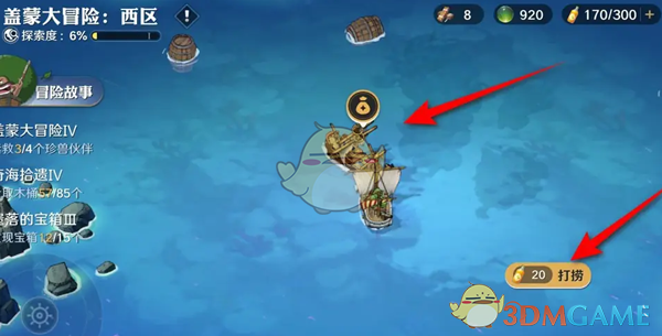1、首先前往冒险玩法,在海域冒险玩法中,点击沉船进行打捞;