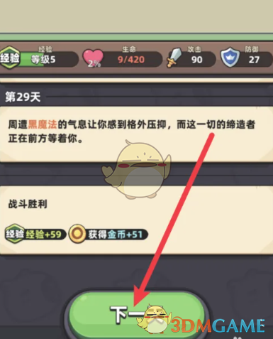 2、之后就可以进入到游戏界面,可以看到当前的冒险旅程,在下方点击下一天。