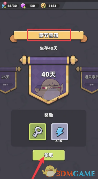 3、打开章节宝箱详情页,可以看到对应的生存天数以及奖励内容,点击下方的领取即可。