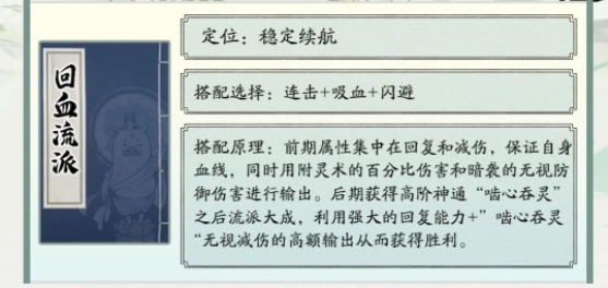 搭配原理:前期属性集中在回复和减伤,保证自身血线,同时用附灵术的百分比伤害和暗袭的无视防御伤害进行输出。后期获得高阶神通“啮心吞灵”之后流派大成,利用强大的回复能力+”啮心吞灵“无视减伤的高额输出从而获得胜利。