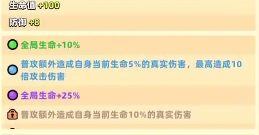 生命值可以增加100,防御值可以增加8,全局生命可以增加10%。普通攻击还可以额外,造成目前生命值大于5%的真实伤害最高就可以造成10倍的攻击伤害。是一个非常出色的道具。