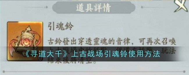 《寻道大千》上古战场玩法中引魂铃是活动道具,玩家们可以通过道具礼包来进行获得,由于很多伙伴们不知道怎么用,接下来小编就为大家带来具体的使用方法,有需要的可以自行查看。
