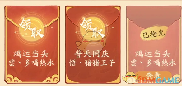 红包总计有三种类型分别是普天同庆、鸿运当头、福星高照!每类红包只能开3个。