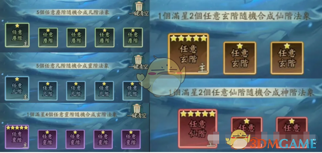 凡阶灵阶比较简单,不到的玄阶-仙阶都比较难合成,5个1星合成下一阶。