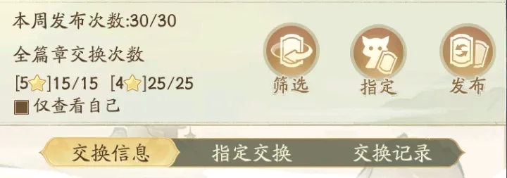 交换:交换也是一个较为重要的地方,可以把自己重复的卡片跟其他道友交换为自己没有的卡片!交换需要注意的是:5星卡片只能交换15次,4星卡片只能交换25次!而1-3星则没有交换次数限制!(闪卡无法交换)