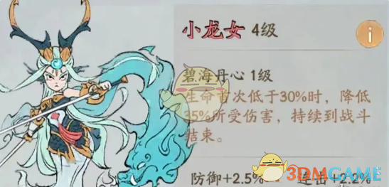 小龙女:4级增加最终减伤+2.2%,每5级增加2.2%。生命值首次低于30%时,降低35%所受伤害,持续到战斗结束。