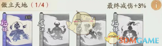 傲立天地:金刚不坏 + 法天象地 + 侵神三重 + 修罗之躯,最终减伤+3%(每次进阶增加3%)。