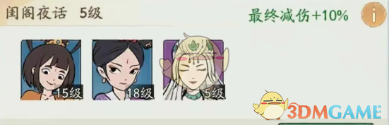 闺阁夜话:于瑶 + 巧手妹妹 + 香夫人,每一级可以增加2%的最终减伤。