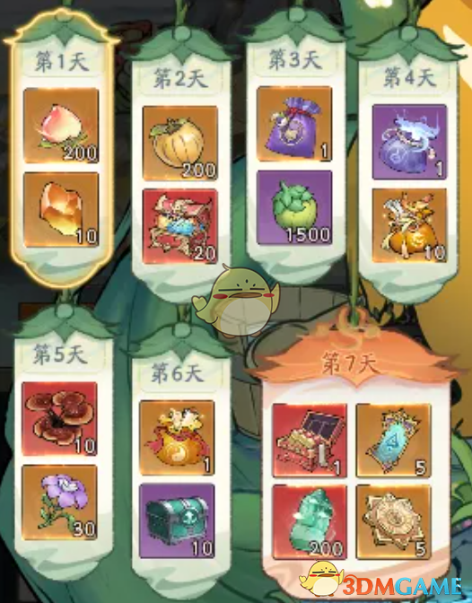 期间参与活动,累计完成1、2、3、5、7次签到即可获得仙桃、净瓶水、仙玉等游戏奖励。
