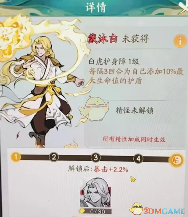 技能白虎护身障:每隔3回合为自己添加10%最大生命值的护盾
