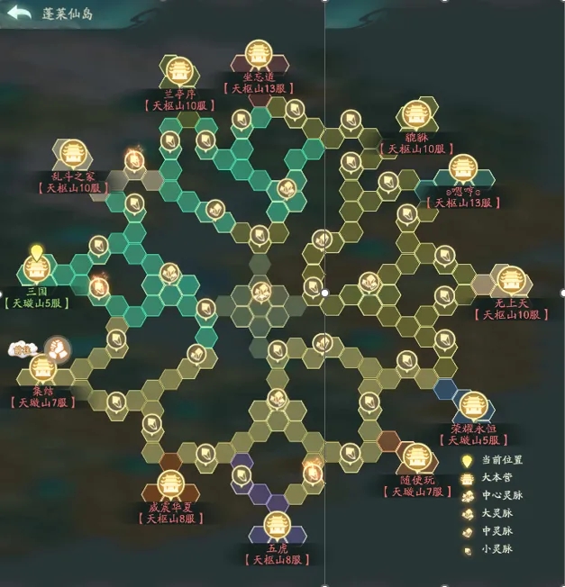 蓬莱地图总共三层,其实三层的地图是一摸一样的,不一样的只有层数越高排名积分获取的越多,地图中总计1个四级灵脉(活动期间每晚8点开放争夺),4个三级灵脉,4个二级灵脉,28个一级灵脉以及12个大本营(大本营积分等同于一级灵脉),灵脉等级越高产生的灵晶越多,所以占领更多的灵脉不仅积分会更高,灵晶也会更多,灵晶可以在商店兑换资源~~