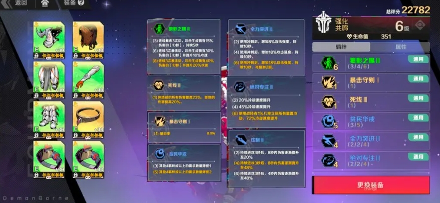 狼影之赐6件套可以在连续3次暴击后,使攻击生成拥有30%生命的幻影并提升10%的攻速,进一步增强了狼哀的输出能力,而死线衣则能将所有造成的伤害提高23%,同时受到的伤害也提高20%,此外,4全力突进、4绝对专注和2压制的搭配也为狼哀提供了强大的战斗增益,全力突进4件套可以在使用冲刺后增加18%的攻击强度,持续10秒,这无疑为狼哀的爆发输出提供了有力支持。