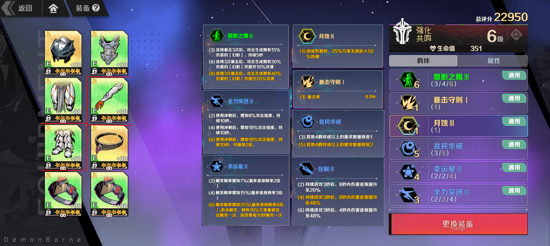 狼影之赐6+月蚀头+暴击项链,4幸运星+4全力突进+2压制