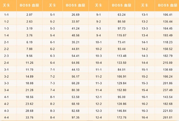 boss与血量的对应关系如下表,单位/亿