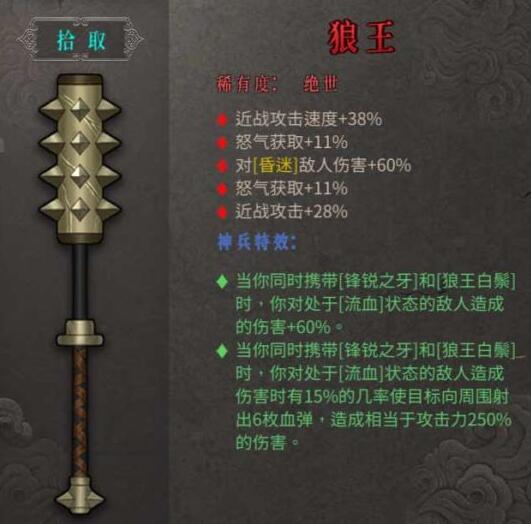 ·当你同时携带[锋锐之牙]和[狼王白鬃]时,你对处于[流血]状态的敌人造成的伤害+60%。