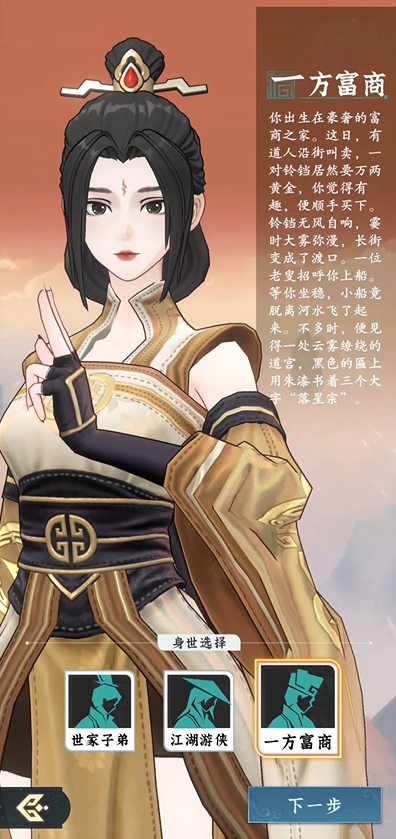 如果你一直梦想着体验“含着金钥匙出生”的修仙人生,那么“世家子弟”会是你的最佳选择。你出生于钟鸣鼎食的豪门之家,家里书籍堆得像山一样高,随便翻翻就可能找到什么神仙留下的秘籍。而这一次,你的机缘藏在一本古老的《神仙传》里。一页泛着金光的神秘金纸,将你引向了一座高耸入云的山峰,最终踏入“落星宗”的修行之路。选择世家子弟开局的玩家,将在初期拥有一些资源上的优势,比如更早获得炼器材料或者丹药。