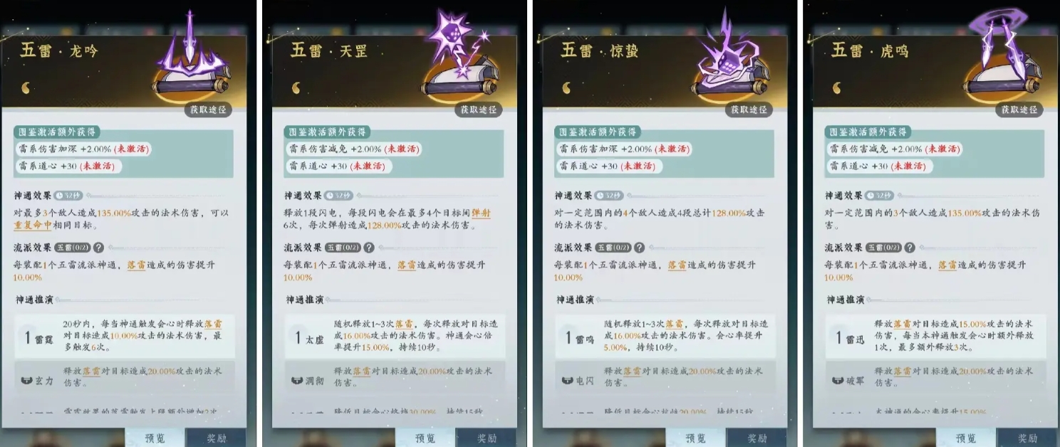 神通效果会对最多3个敌人遗成135.00%攻击的法术伤害,可以重复命中相同目标,释放1段闪电,每段闪电会在最多4个目标间弹射6次,每次弹射造成128.00%攻击的法术伤害,对一定范围内的4个敌人造成4段总计128.00%攻击的法术伤害,最后一个神通是对一定范围内的3个敌人造成135.00%攻击的法术伤害,神通达成雷鸣之后,会随机释放1~3次落雷,每次释放对目标造成16.100%攻击的法术伤害,会心率提升1雷鸣5.00%,持续10秒时间。