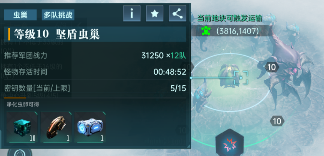 大地图上可以看到虫族军队守卫的宝藏点,也可以通过搜索界面搜索。