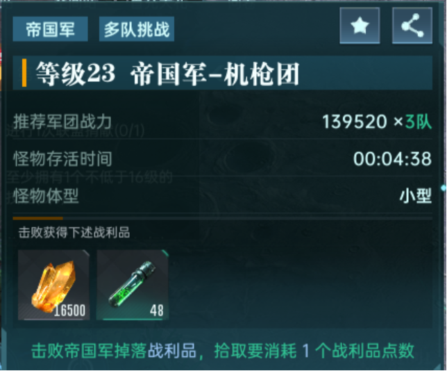 成功挑战分布在地图上各处的帝国军后可掉落对应等级的帝国战利品,越高级的帝国战利品会产出更多的资源,可以使用自身的多个队伍或者协同其他玩家一起攻击帝国军。