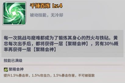 黄忠是一名强而有力的战将。黄忠在持久对局中有着较高的优势,他有着独有的【聚精会神】BUFF机制,随着行动次数越多,自身的属性也会逐步以百分比的幅度提升,可谓越战越勇。如果遇到无法快速结束的战斗,黄忠可以作为一个对策英灵加入队伍。