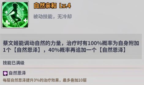 蔡文姬在治疗方面尤为凸出,提供治疗的同时,还可以同时附加【持续治疗】的状态,提升队伍的续航能力,并且被动技能获得的【自然恩泽】效果可以进一步提升治疗能力。