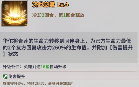 致尊敬的调查员,无双神将英雄【华佗】是冒险旅途中一名强而有力的战将。与【蔡文姬】定位相似,属于辅助与治疗双修的英雄。技能可以为部分己方单位恢复生命的同时提供增伤效果。但是比起增伤效果,华佗的群体治疗能力与特有的复活能力更为出众,面对高压敌人时,华佗也是一张有效的对策解。