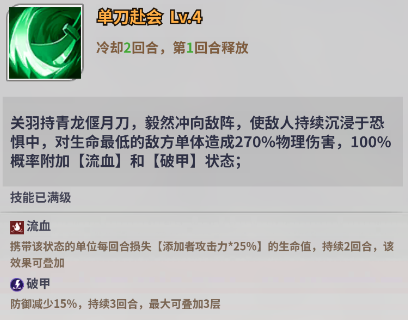 无双英雄【关羽】是冒险旅途中一名强而有力的战将。关羽有着相当优秀的输出性能,技能伤害不凡的同时可以挂风系的流血状态;自身可以附加破甲效果,增加队伍的输出上限;击杀回血机制更是为自身提供了一定的续航能力。所以在配队方面更加宽泛,不会有特殊的机制限制,尽可能将输出最大化就是唯一方向。