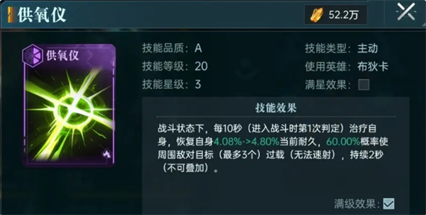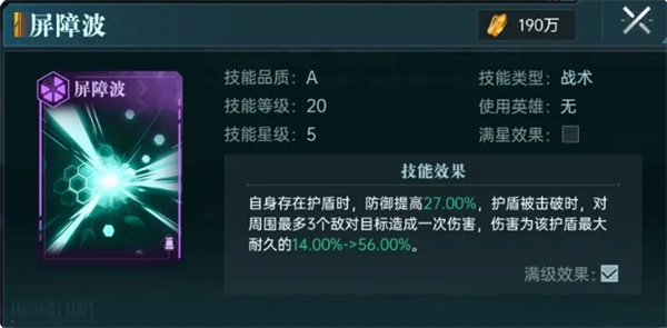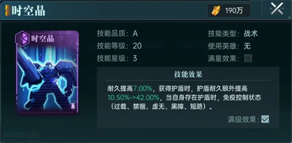 【时空晶】则作为一个增幅技能来强化护盾量以及带来免控效果,未升阶的情况下满级提供5%的耐久和30%护盾值,完美契合整个队伍所需要的属性。