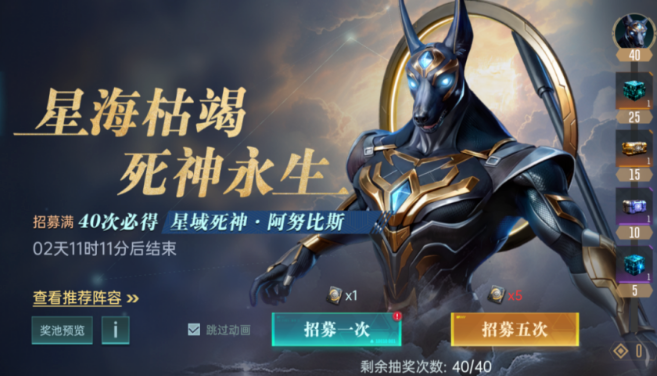 在辅助治疗队当中,阿努比斯是建议选择的,如果玩家想要获得阿努比斯的话,可以通过限时开放的星域死神这个招募活动直接获取。要说阿努比斯在游戏当中,他作为治疗队的核心英雄,毕竟他的单体治疗特别的优秀,而他的神圣转生能够有效地提高治疗效果,在战斗的时候能够恢复自身以及周围同伴的血量。