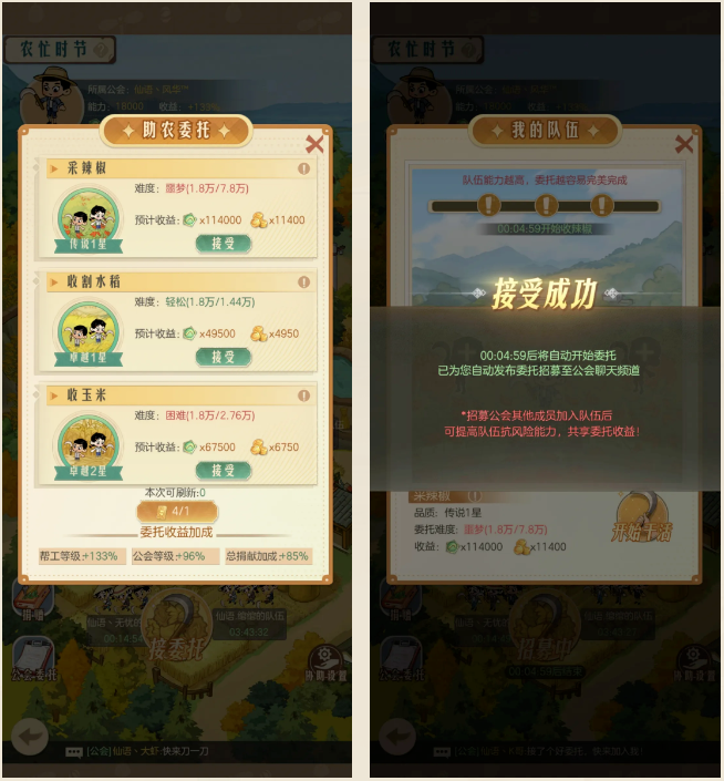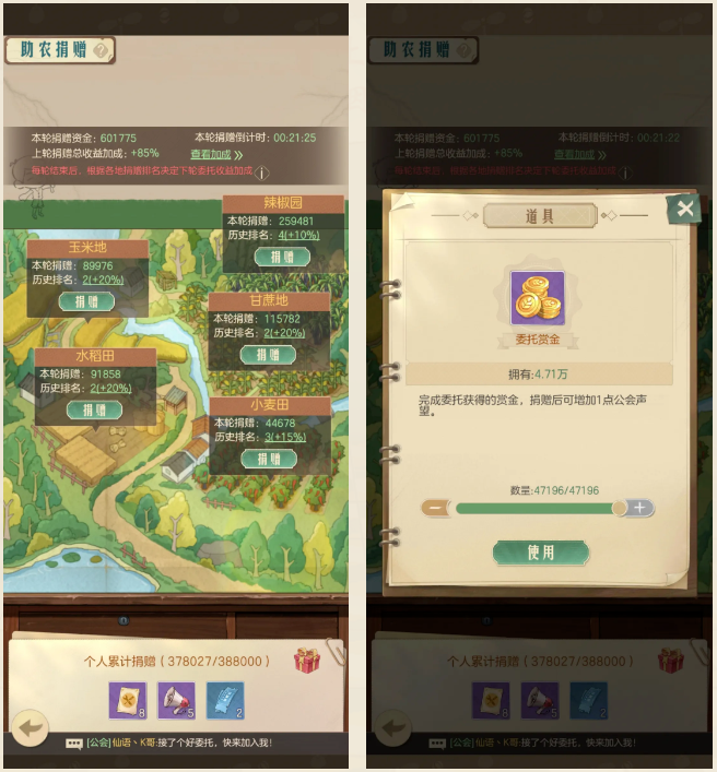 通过完成助农委托可以获得委托赏金进行捐赠,公会集体活跃可以平均捐赠,拿到5个地方的加成,这样的收益是最大化的。