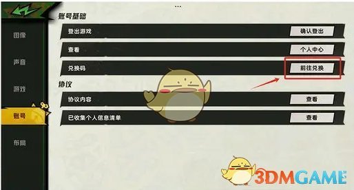 2、然后在游戏设置页面,点击左侧的账号,在账号基础中点击兑换码前往兑换;