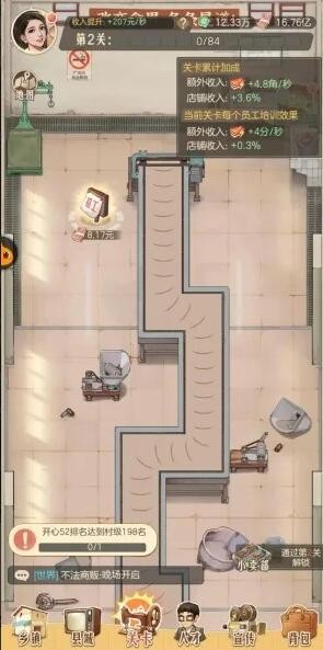 1、通过培训员工进行作坊运转进行关卡的推进,推进的关卡越多获得的收入越多。