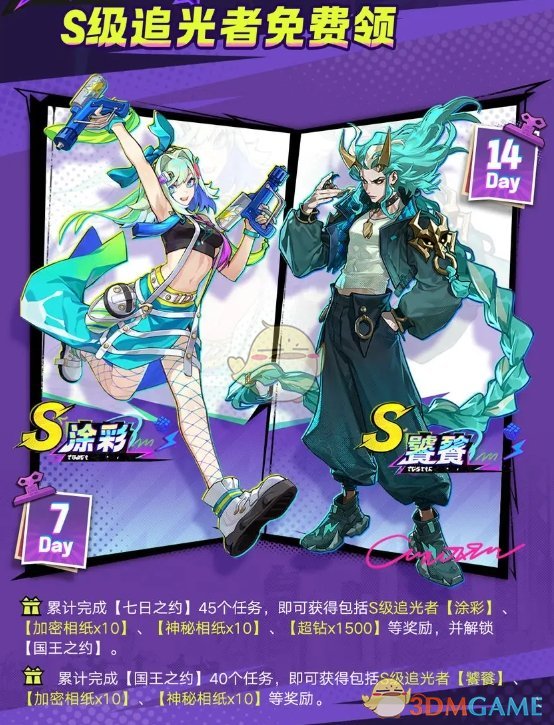 完成七日之约的45个任务后,即可获得S级追光者【涂彩】【加密相纸x10】、【神秘相纸x10】、【超钻x1500】奖励