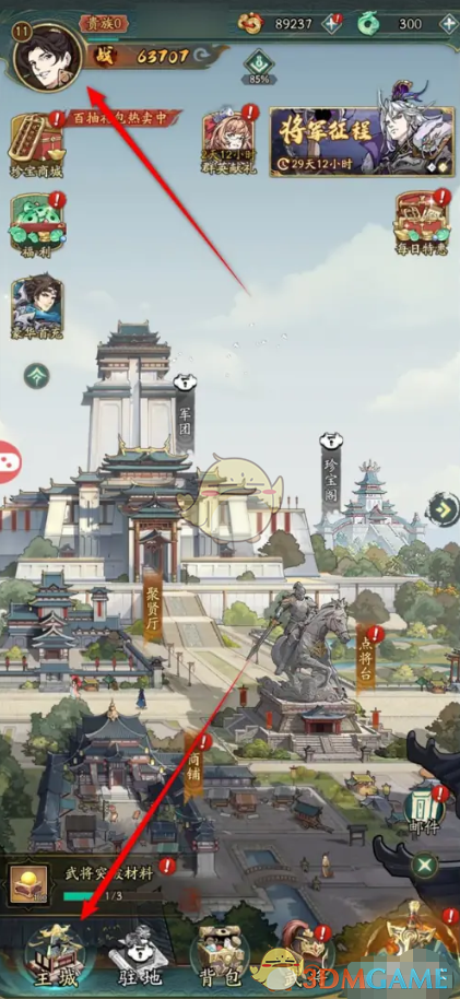 1、首先我们需要进入到游戏主界面,在下方靠左侧点击主城,再点击左上角的玩家头像。