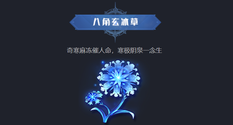 第2种仙草的名字叫做八角玄冰草,它的所有属性与烈火杏娇疏都是完全相反的,当玩家站在它的周围时,就会感觉到浑身似乎都被冰冻住了。这种仙草目前只在一个地区生存,那就是寒极阴泉的中心点。八角玄冰草与与烈火杏娇疏是两种相辅相成的仙草,当小伙伴们需要进入冰火两仪眼时,就需要同时服下这两种仙草,质量原本两种互相排斥的毒素才能够转变为相辅相成,而同时对于体质属性也有奇效。