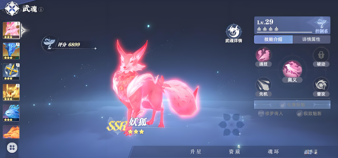 在斗罗大陆猎魂世界中,妖狐是SSR稀有度的顶级控制系武魂,以魅惑控制和隐身位移闻名,妖狐最擅长的就是在战斗中,扰乱敌人的阵型,在PVP和PVE模式中成为玩家们的首选,妖狐更是许多喜欢掌控全局的玩家的必选,玩家们可以在卡池中抽取妖狐。