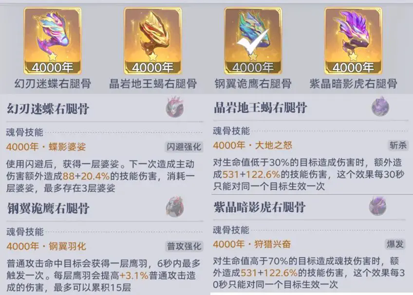 那么在这4个效果中,从直接伤害比例和衍生效果来分析,维一更加倾向于刚翼鹰和紫晶虎这两个选择,因为不仅基础伤害比例不错,同时衍生效果想要达成的门槛也不算很高,大家用的队伍带较多普攻的就可以选择刚翼鹰,其余的则可以选择紫荆虎,另外这两个魂骨在特定的条件和年份下也有双倍攻击的效果,大家可以注意下。