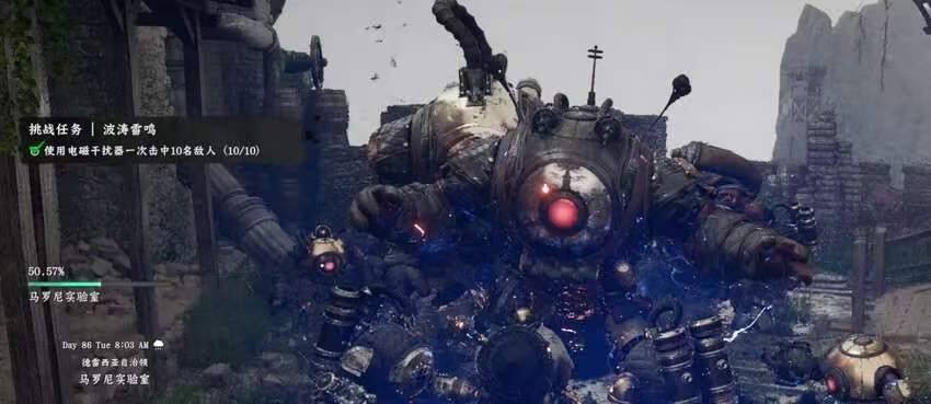 第一项任务是电磁干扰器一次击中十名敌人。玩家需要在通关主线第十章后获取电磁干扰长枪,随后等待机器人聚合时进行一次攻击即可。或者前往德雷西亚研究所二楼,研究机械科学解剖后制造电磁干扰器即可完成。
