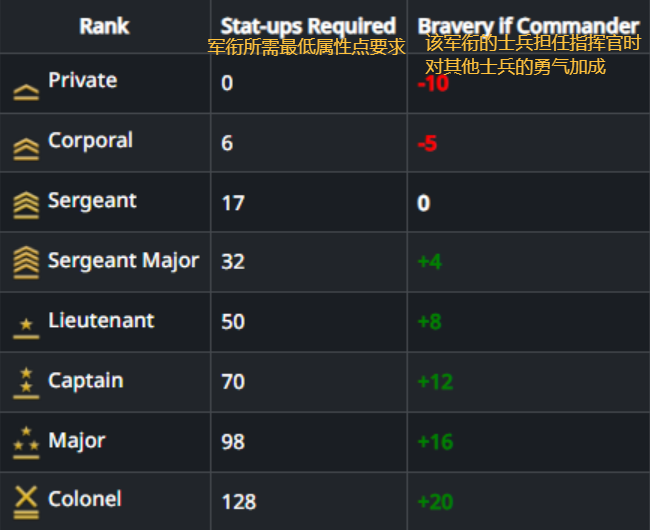 每名士兵都会有一个军衔,军衔由其所有属性所获得的提升量决定。