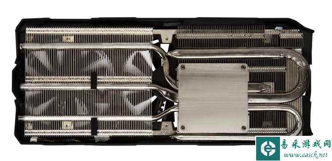 散热器采用两段式布局,配备三根热管,体积大、分量重。散热片间隔缝隙均匀。三根纯铜镀镍热管,采用穿FIN工艺和散热块接合。左边两根热管外径8mm,大面积纯铜底座,采用成熟的铣底工艺,并且都经过镀镍抗氧化。